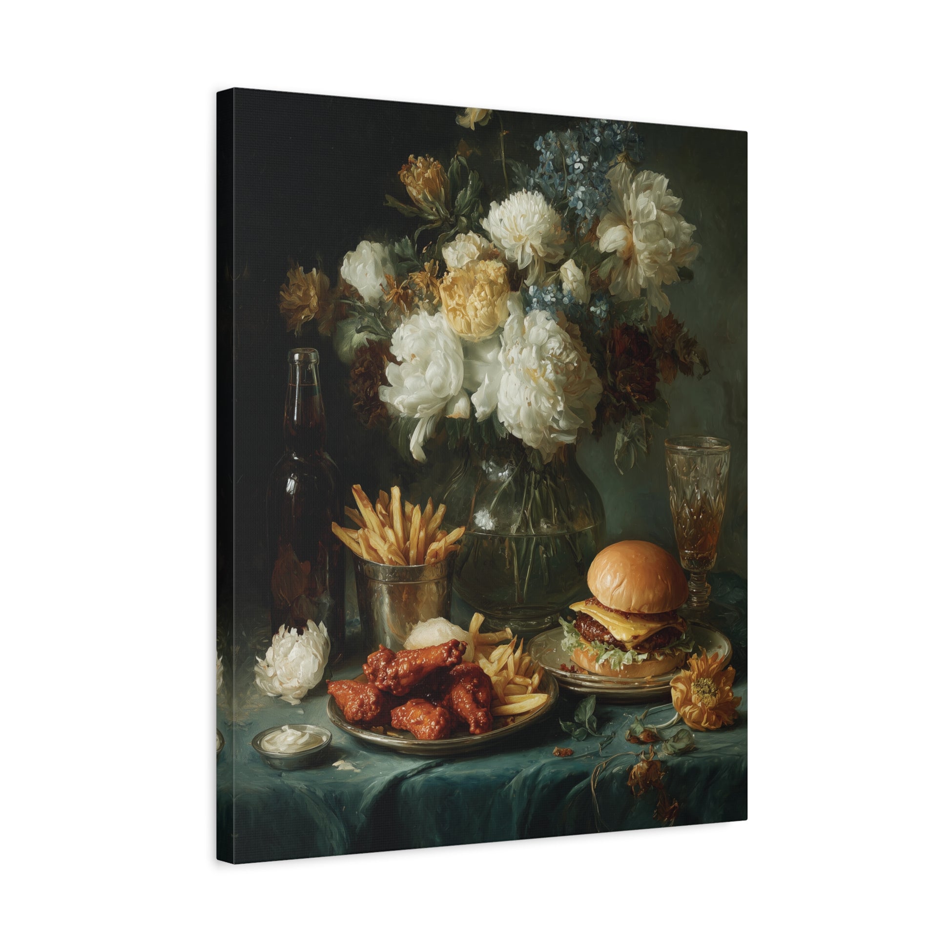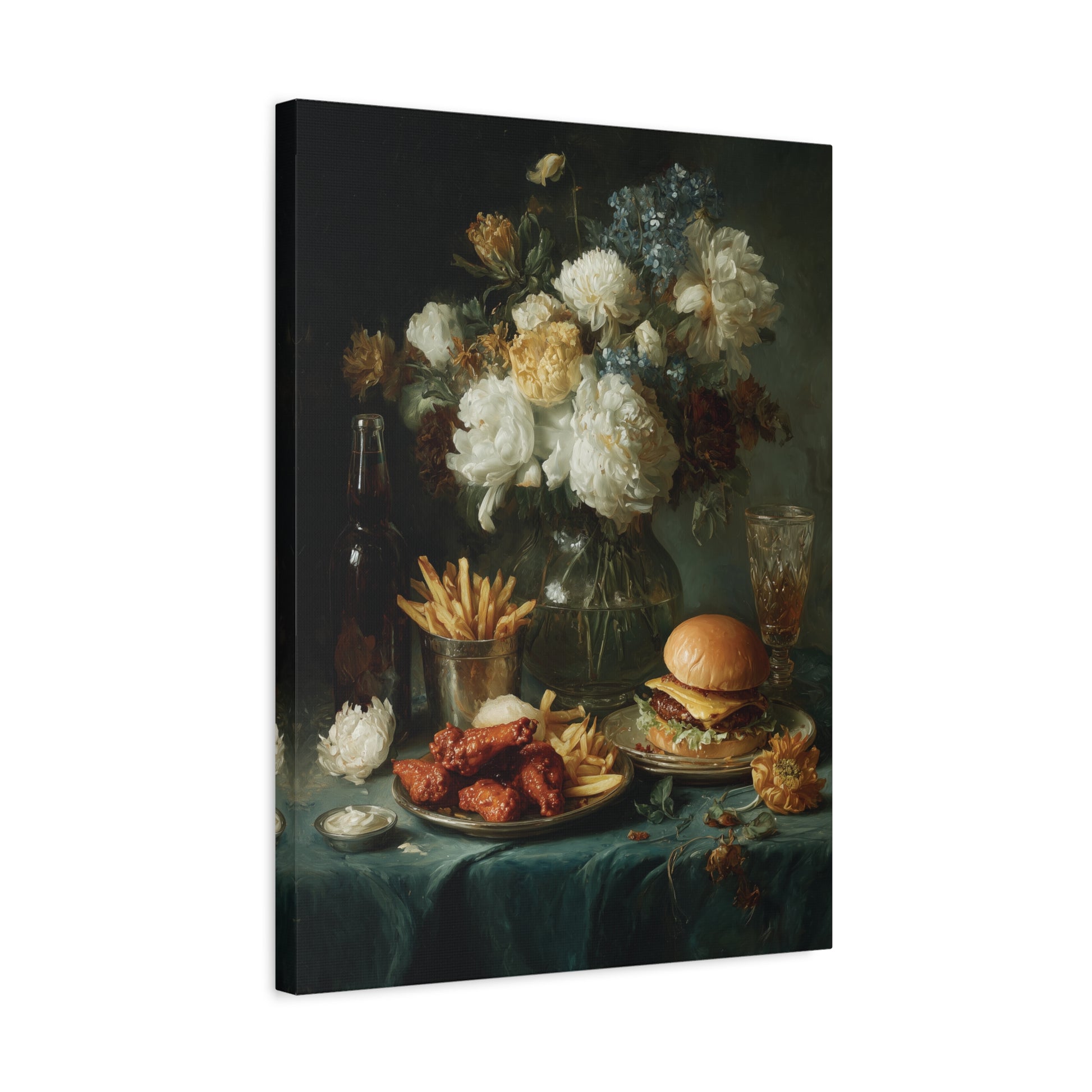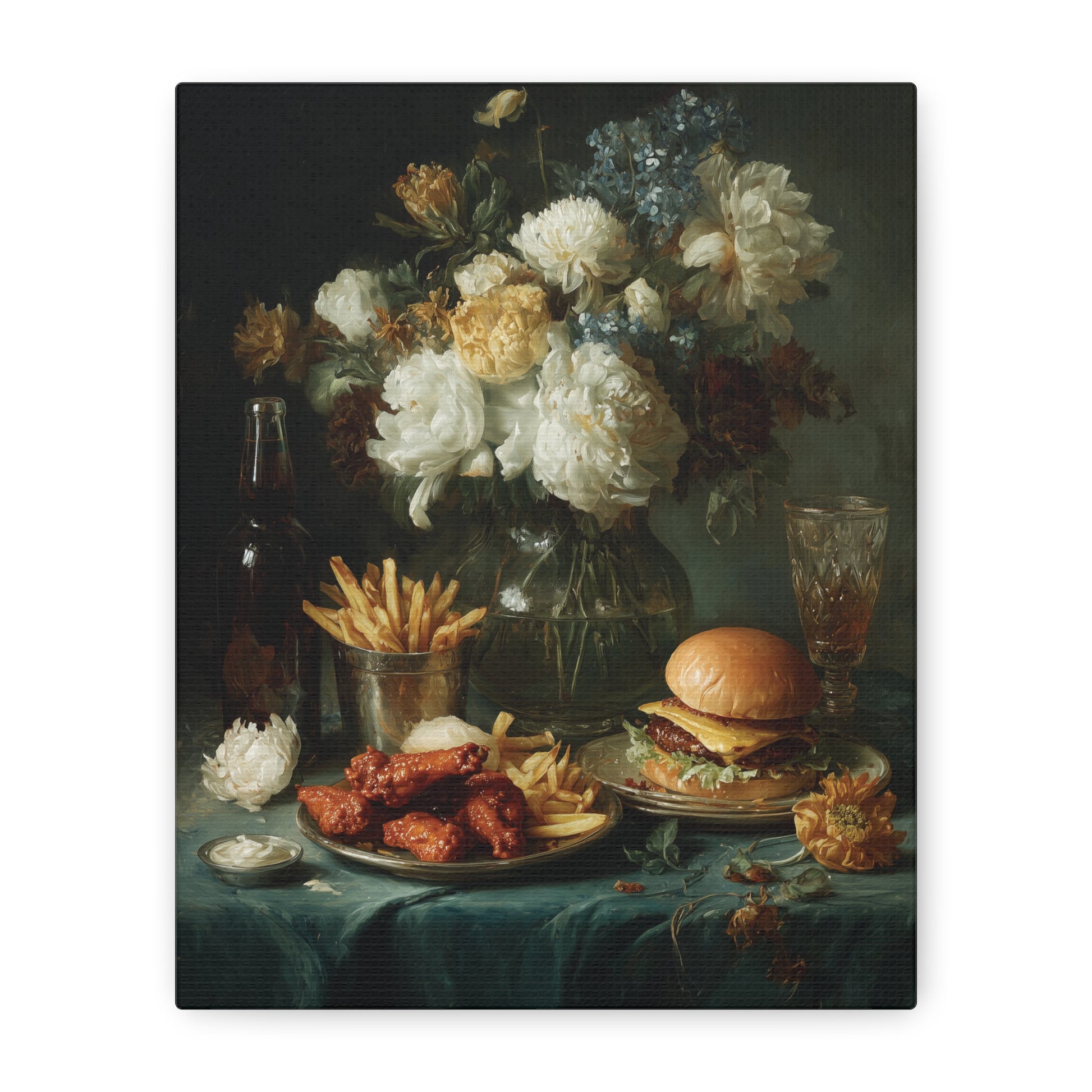 This wings and burgers still life foodie art canvas print exudes a trendy and culinary vibe, perfect for food lovers and home chefs. It adds a touch of whimsy to kitchen decor and is ideal for creating a cozy atmosphere during family gatherings, holidays, and dinner parties.