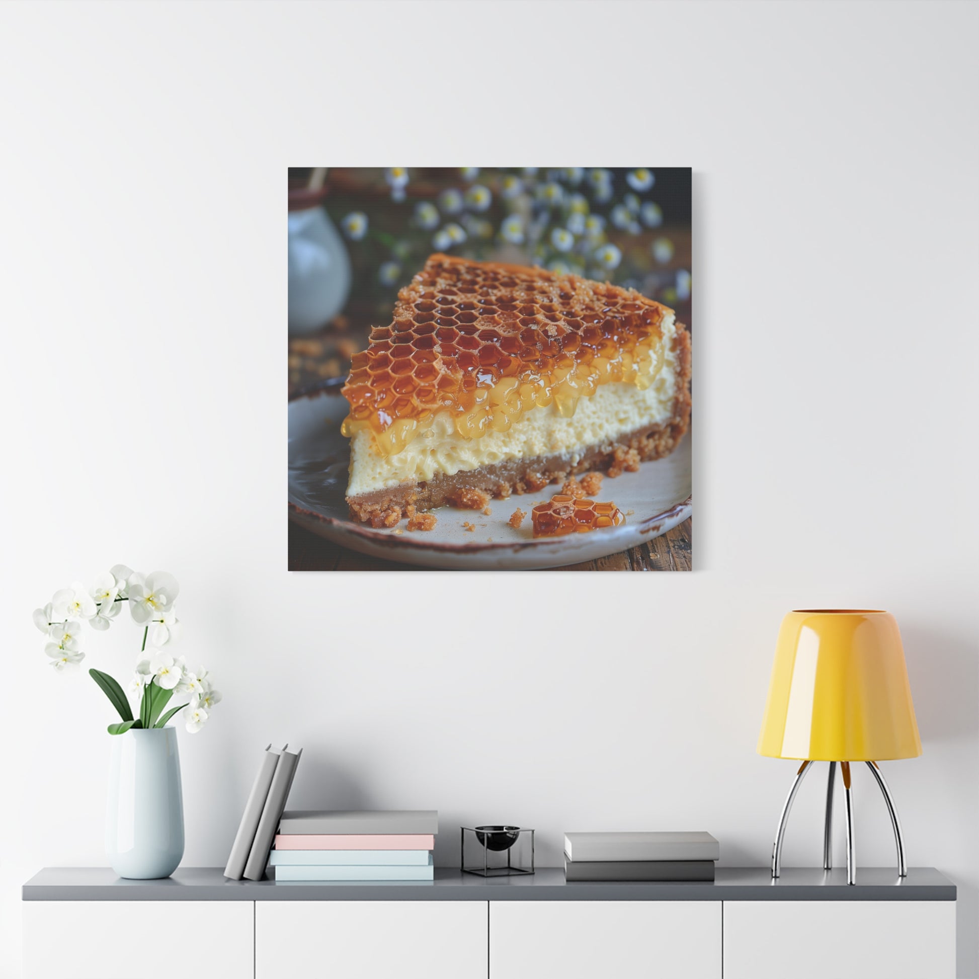 A beautiful honeycomb cheese cake canvas art that adds a touch of whimsy and charm to any room. Perfect for foodies, home cooks, and those who love unique artwork. Ideal for kitchen decor, food lovers, and those celebrating birthdays or anniversaries.